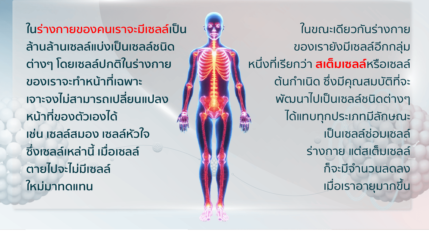 ณ ปัจจุบัน เรามักได้ยินคำว่า สเต็มเซลล์ (Stem Cell) เกี่ยวกับประโยชน์ที่ใช้ในการรักษาโรคต่างๆ ที่สำคัญสเต็มเซลล์ยังเป็นที่นิยมในการนำมาใช้เสริมสร้างความอ่อนเยาว์ และการชะลอวัย (Anti-aging) การเก็บสเต็มเซลล์เป็นที่นิยมมากทั้งในประเทศไทยและต่างประเทศ เนื่องจากในวงการแพทย์และนักวิทยาศาสตร์มีความเชื่อว่าสเต็มเซลล์ถือเป็นกุญแจดอกสำคัญที่ใช้ในการรักษาโรคในอนาคตของวงการแพทย์ทุกวงการ เพราะสามารถใช้ รักษาทุกโรคที่เกี่ยวกับความเสื่อม ซึ่งจะส่งผลให้ชีวิตมนุษย์ยืนยาวขึ้นได้ เนื่องจากหน้าที่ของสเต็มเซลล์คือการนำเซลล์ใหม่มาทดแทนเซลล์เก่า อาทิเช่น ผู้ป่วยโรคหัวใจ สเต็มเซลล์ในร่างกายของผู้ป่วยเองไม่มีความสามารถมากพอที่จะรักษาบาดแผลได้ด้วยตนเอง เมื่อเกิดภาวะหัวใจวายกะทันหัน โอกาสที่ผู้ป่วยคนนั้นจะมีชีวิตรอดมีน้อยมาก หากไม่ได้รับการปลูกถ่ายสเต็มเซลล์มาก่อนหน้านั้น เพราะสเต็มเซลล์ทำหน้าที่ช่วยซ่อมแซมหัวใจได้ อีกทั้งยังช่วยเพิ่มความสามารถของร่างกายในการรักษาบาดแผลที่เกิดขึ้นในบริเวณต่างๆ ของร่างกายเขียนข้อความของคุณที่นี่...
